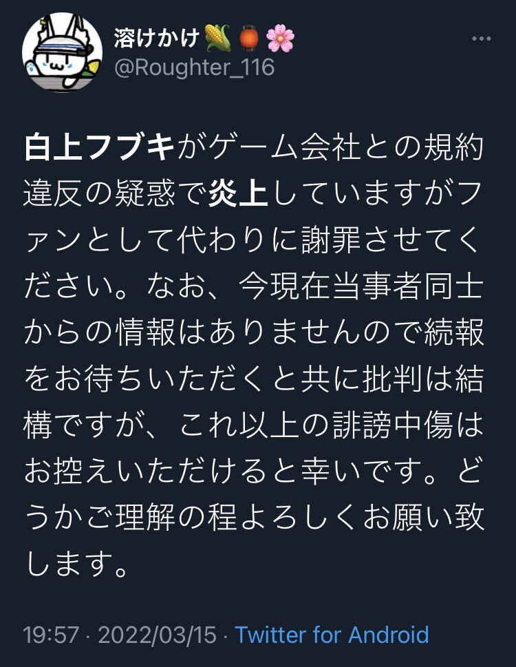 【画像】ホロライブVtuber白上フブキちゃんの炎上問題、ファンが代わりに謝罪wwwwwwwwwwwwwwwww