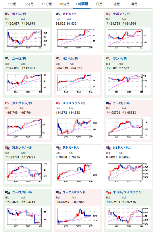 東京時間で一旦129円を割りそうなところまで円高になったドル円は欧州市場開始後に130円台後半まで。