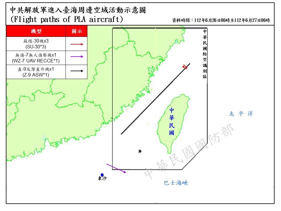 Taipei, June 27 (CNA) Taiwan’s military reiterated its stance Tuesday that it will attack Chinese warships and warplanes in a defensive action if they are detected within Taiwan’s 12-nautical-mile territorial space.