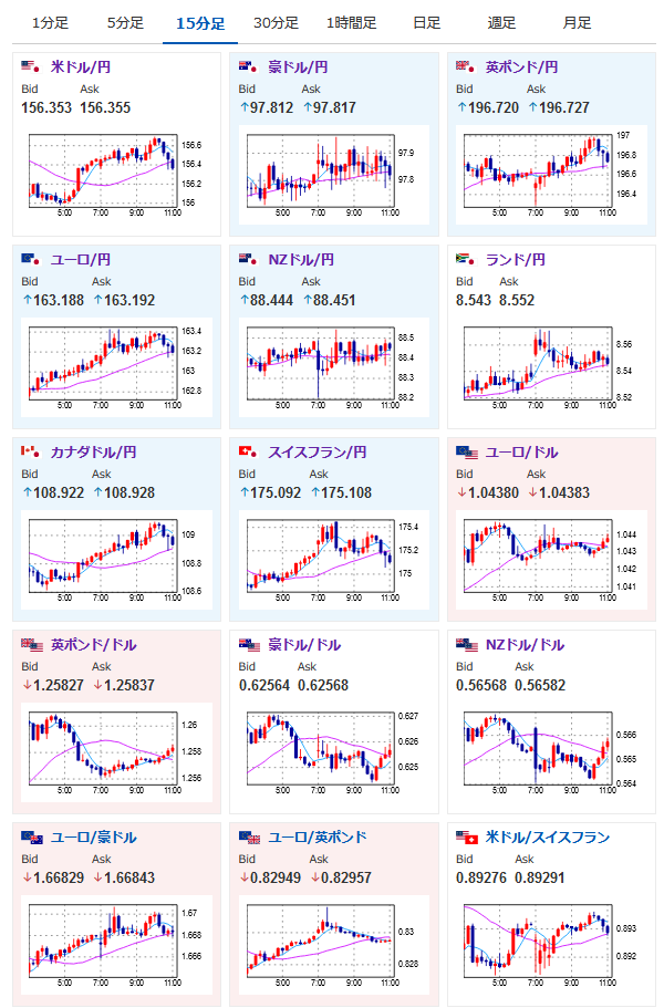週明け、初動はドル円は一旦156円割れ、そして156円台後半に向けて円安に。